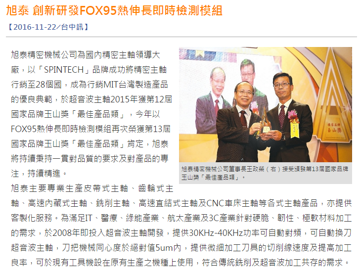 FOX95光學熱伸長感測主軸-榮獲『十三屆玉山獎-最佳產品』
