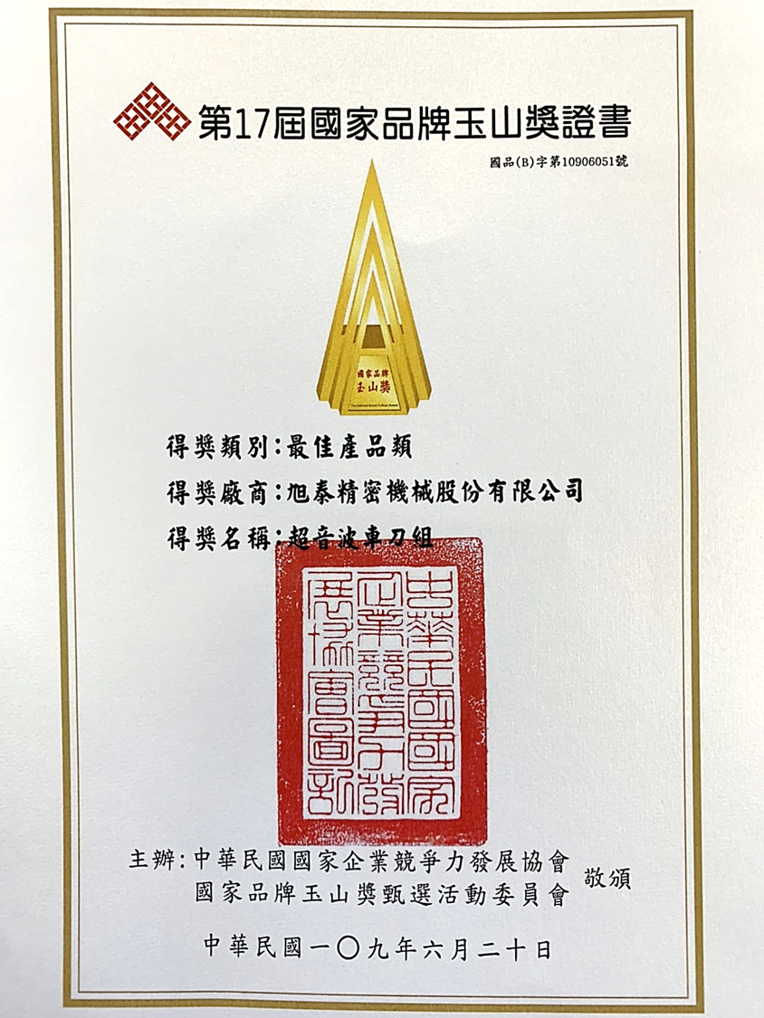 旭泰超音波車刀-榮獲『第十七屆國家品牌玉山獎-最佳產品』